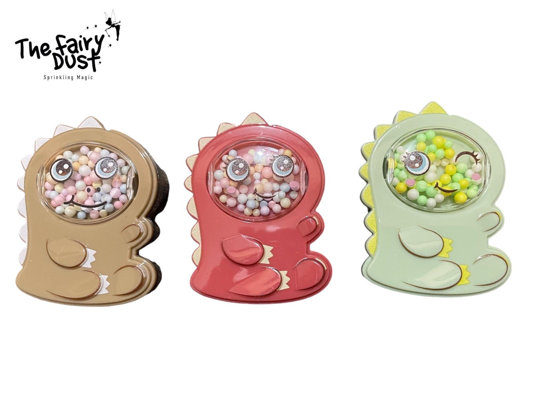 Cute dinosaur-shaped sharpeners. Each sharpener has a transparent belly filled with colorful beads and glittery, cartoonish eyes that give the dinosaurs a fun and playful look. These sharpeners are designed to add some magic to everyday tasks with their fun, creative design. They could be perfect for children or anyone who enjoys quirky, cheerful stationery!