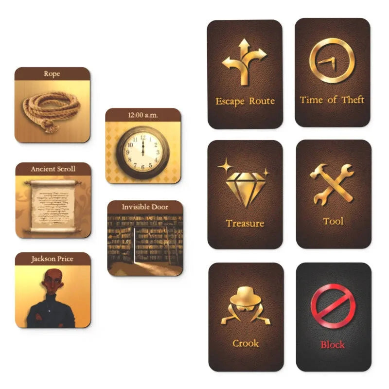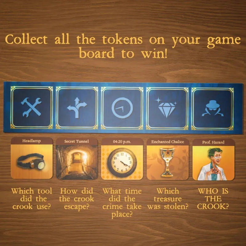 An easy-to-learn strategy board game, perfect for family game nights. Get ready to strategize and beat your opponents as you collect all the tokens and become the first player to catch the crook! Remember to use your game cards to block your opponents from playing their turn! Packed with limitless replay-ability, the variable gameplay ensures that you will never solve the same mystery twice!