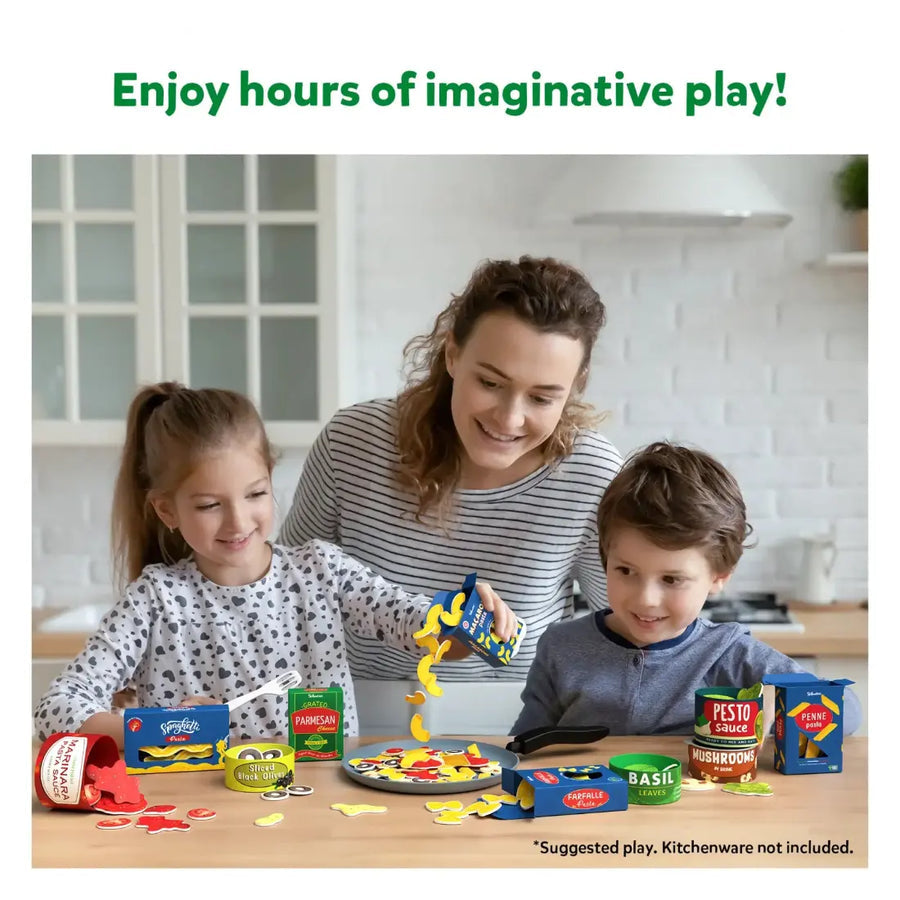 Children can let their creativity flourish as they explore a variety of pastas, sauces, and toppings. With 4 types of pasta—Penne, Farfalle, Spaghetti, and Macaroni—the cooking possibilities are virtually limitless. They can craft a new pasta dish each time using these sturdy kitchen food toys.